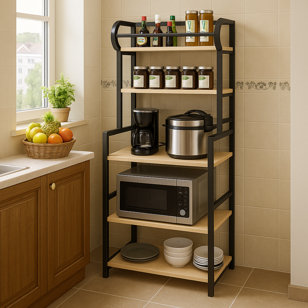 Add elegance and functionality to your kitchen with the Culina Multi-Tier Rack. Designed with a sturdy black metal frame and spacious wooden shelves, this rack offers ample storage for jars, utensils, and small appliances. Its sleek vertical design saves space while keeping your essentials organized and within reach.