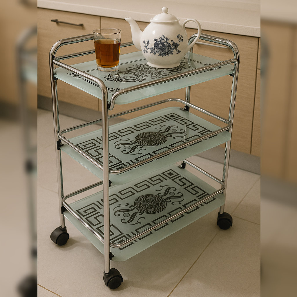 This is a sleek three-tier chrome trolley with frosted glass shelves featuring a floral pattern. It has curved handles and four wheels for easy mobility, blending modern design with functionality.